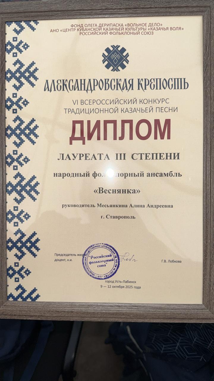 Ставропольский ансамбль «Веснянка» стал лауреатом III степени на VI Всероссийском конкурсе традиционной казачьей песни «Александровская крепость», который проходил в Усть-Лабинске и собрал лучших исполнителей со всей страны.