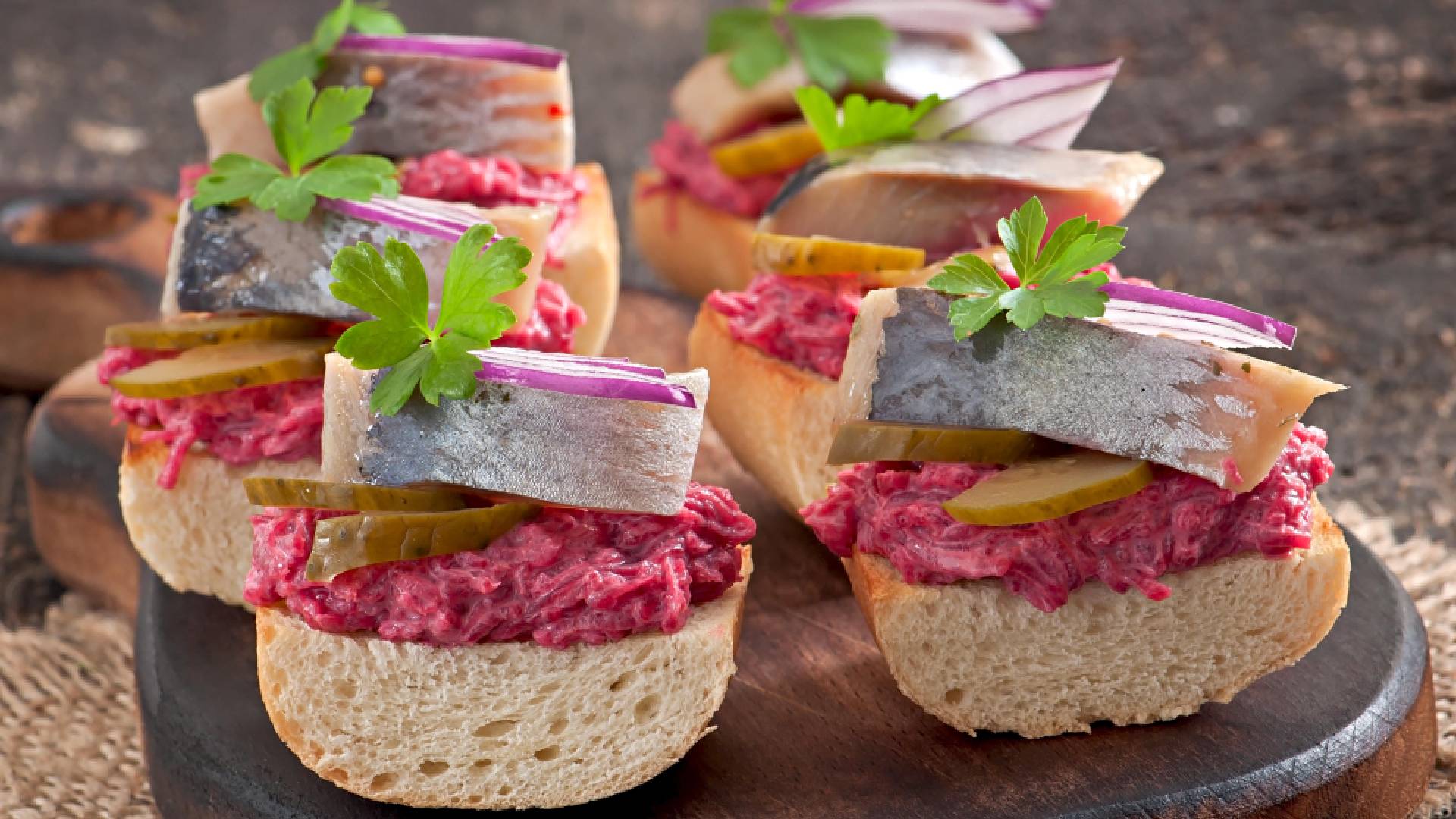 Маринованные огурцы порежьте на тонкие пластинки. Филе селедки — на полоски. Начинайте собирать канапе. Выкладывайте на хлеб одну ложку свекольной подушки. Сверху на нее сверху кусочек сельди и огурчик. Закрепите шпажкой, рекомендует Дзен-канал «6 Соток».