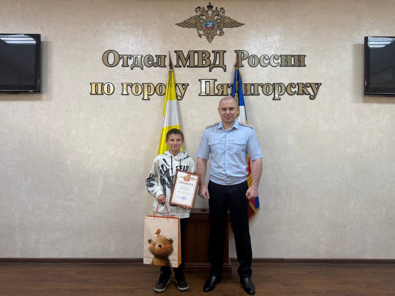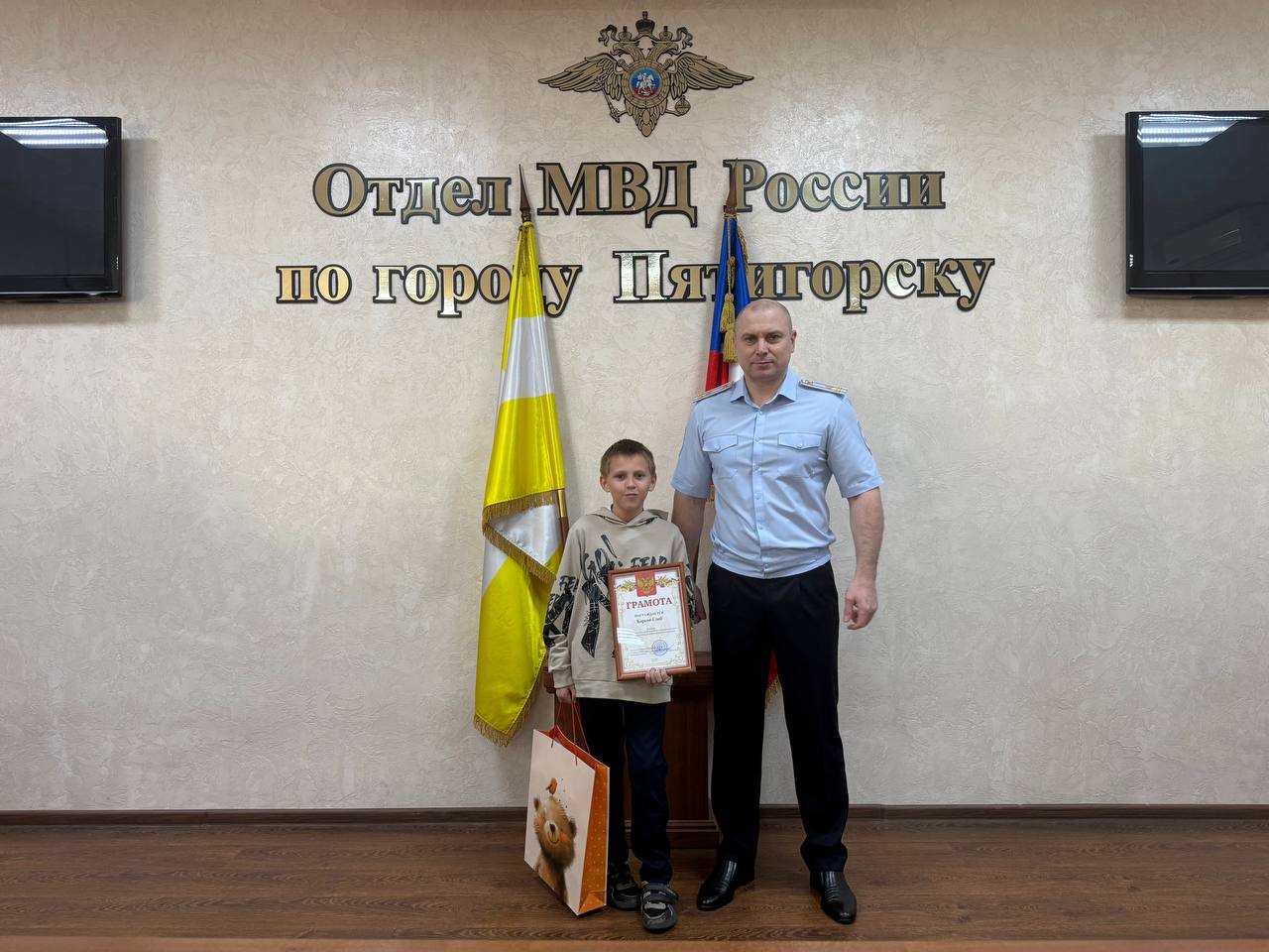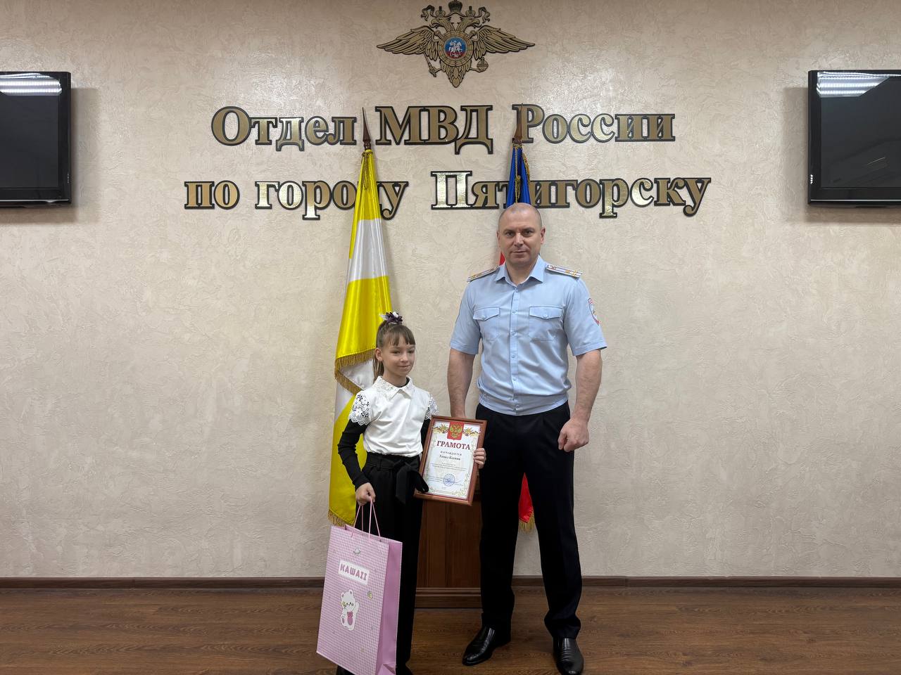 Сотрудниками полиции города-курорта совместно с почетным гостем была организована церемония награждения детей, принявших участие в окружном этапе Всероссийского конкурса детского творчества «Мои родители работают в полиции».