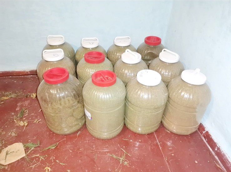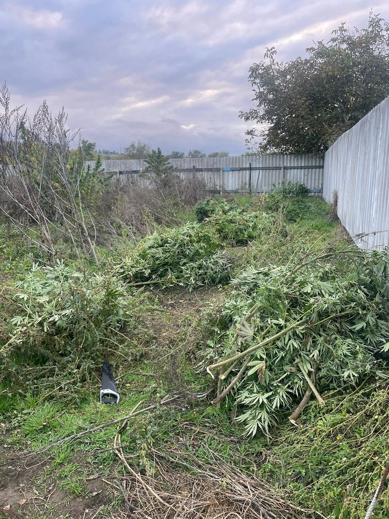 Наркосодержащие растения, растущие во дворе, достигали почти двух метров в высоту. Сушил растения мужчина в доме на веревках у потолка, а хранил в мешках и пятилитровых емкостях.
