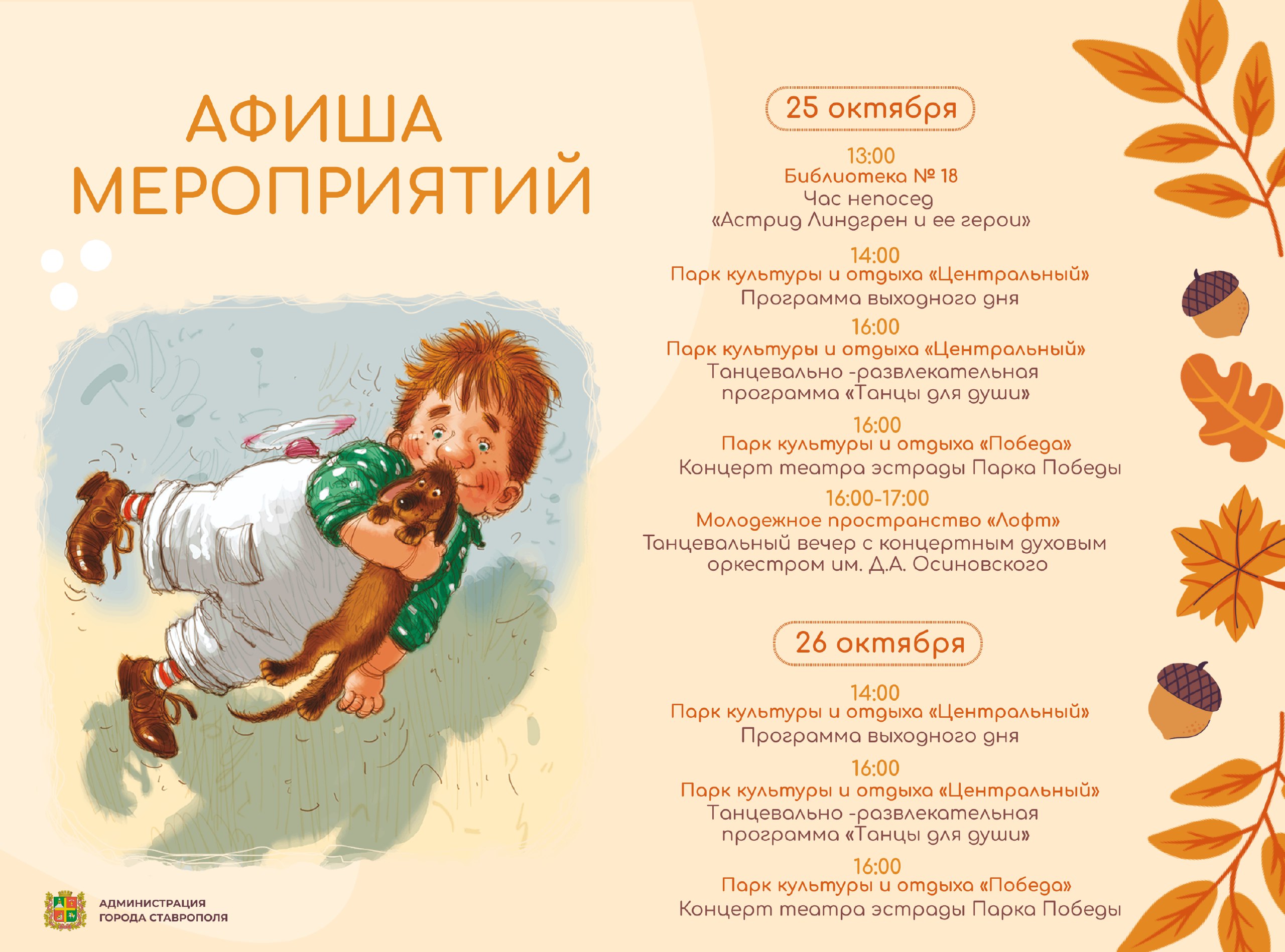 Жителей и гостей Ставрополя приглашают провести последние октябрьские выходные в атмосфере творчества, искусства и хорошего настроения. В субботу и воскресенье в городе состоятся концертные и познавательные мероприятия для всей семьи. Подробности в нашей афише.