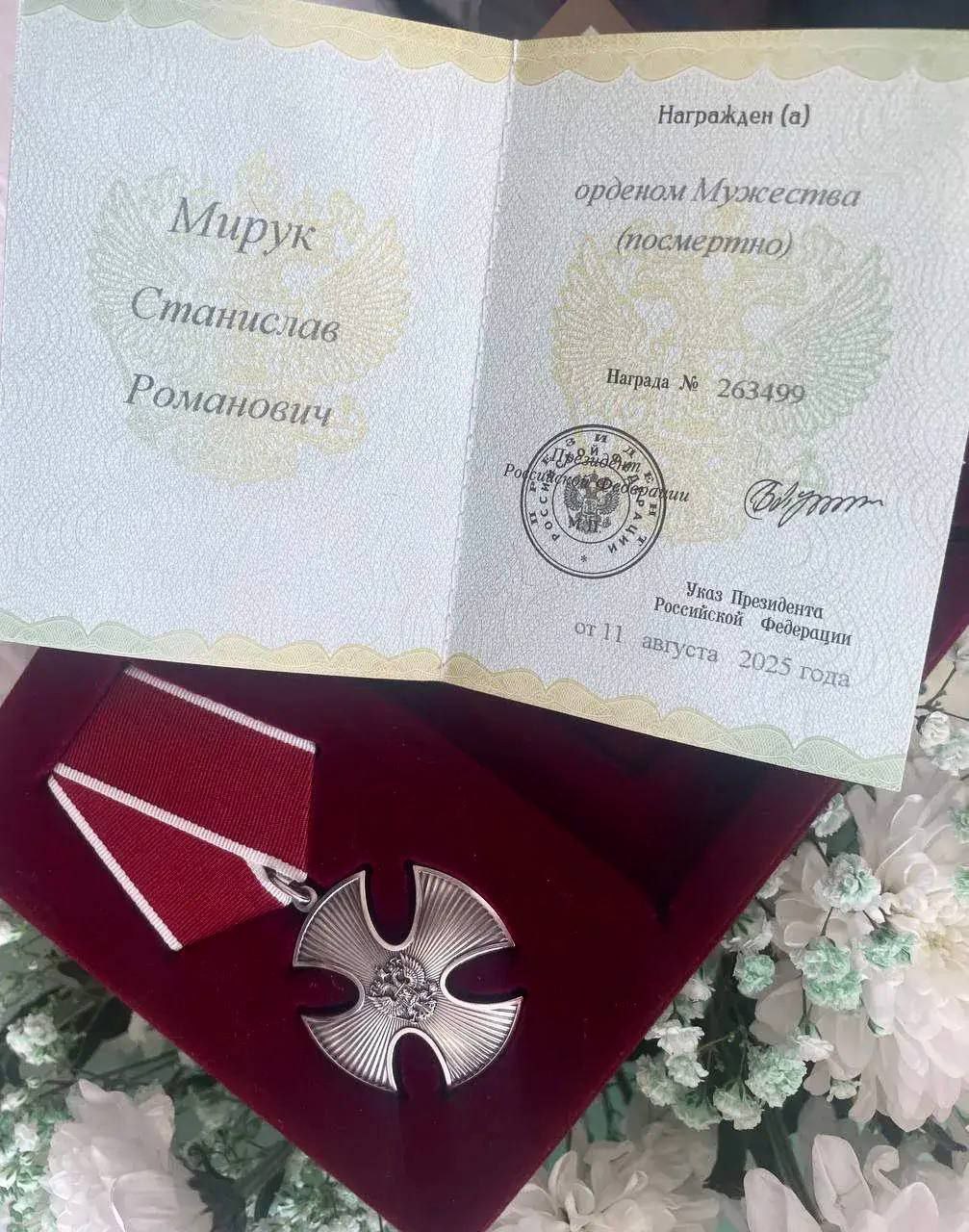 Приказ о присвоени награды за проявленные мужество и героизм при исполнении воинского долга подписал президент РФ 11 августа 2025 года. Орден Станислава Мирука вручили его вдове и сыну.