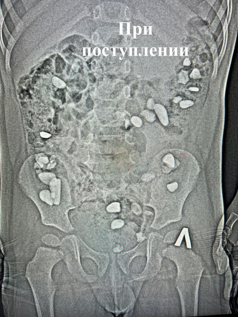 Мальчик поступил в больницу с жалобами на боли и вздутие живота. Рентгенологическое исследование показало, что в проекции толстой кишки присутствует множество инородных тел разного размера.