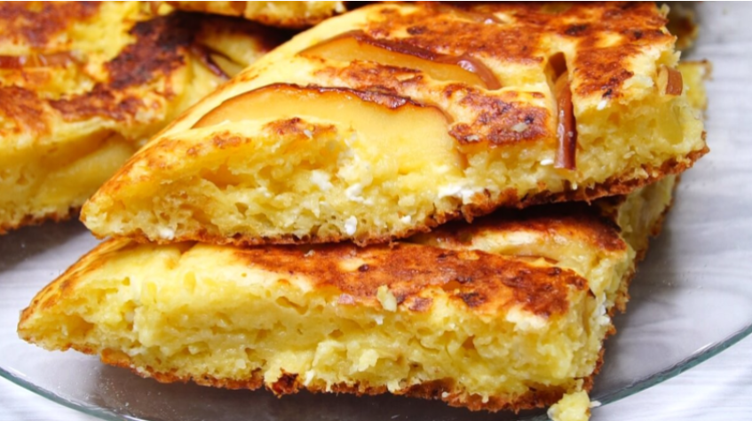 Закройте крышку и готовьте на медленном огне, постепенно увеличивая время от 15 до 25 минут. Как только нижняя часть станет золотистой, осторожно переверните лепешку на другую сторону с помощью тарелки. Завершите приготовление еще 10 минут под крышкой. Снимите с огня и нарежьте на порции. Подавайте с сметаной и горячим чаем или кофе.