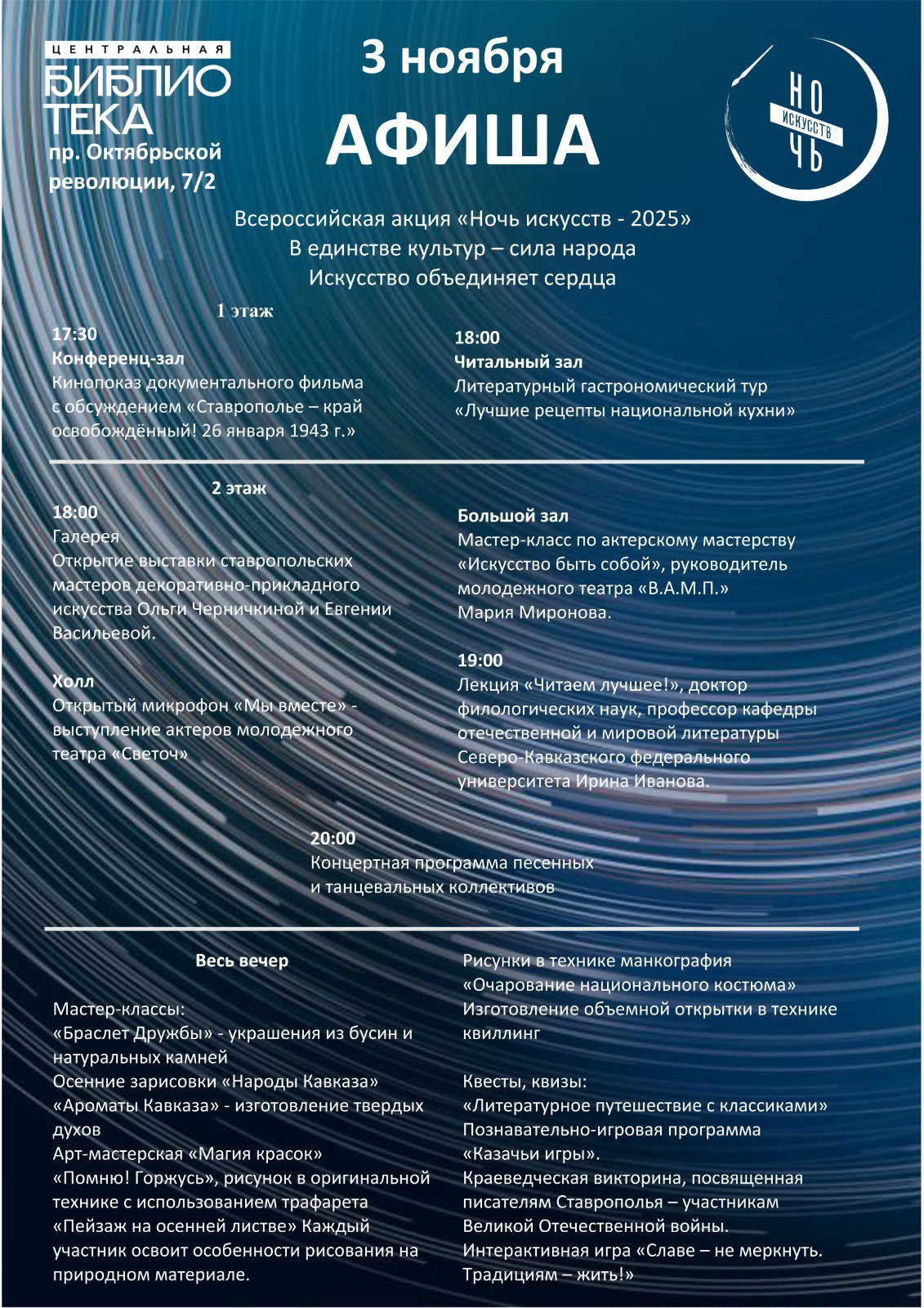 3 ноября центральная библиотека Ставрополя ( проспект Октябрьской Революции, 7/2) приглашает жителей и гостей города на программу «Искусство объединяет сердца», которая пройдет в рамках всероссийской акции «Ночь искусств – 2025». Этот вечер станет праздником творчества, общения и вдохновения, где каждый найдет что-то близкое себе — кино, литературу, музыку, историю или мастерство .