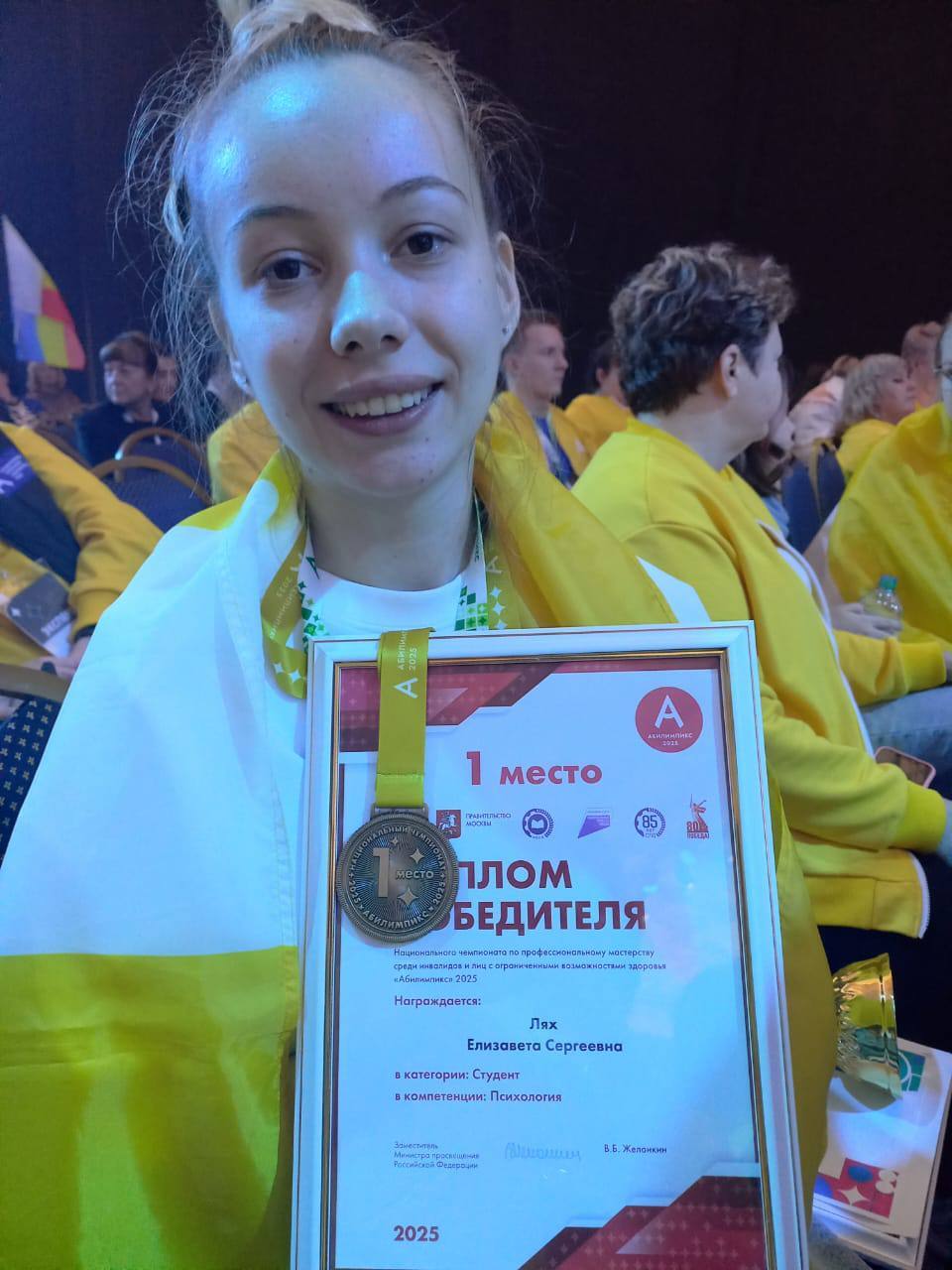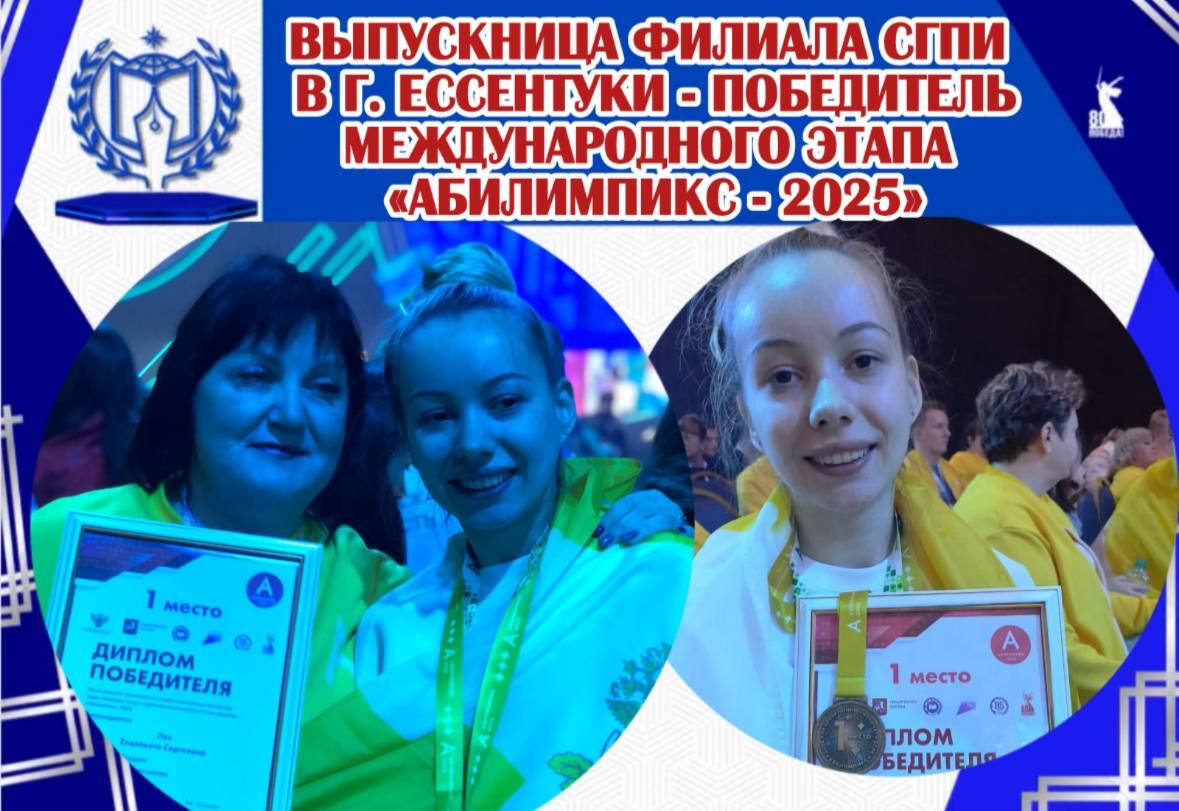 Выпускница филиала СГПИ в городе Ессентуки 2025 года по профилю «Психология и социальная педагогика» Елизавета Лях и её наставник — доцент кафедры специального и инклюзивного образования Светлана Викторовна Телешева — завоевали победу на международном этапе Национального чемпионата «Абилимпикс».