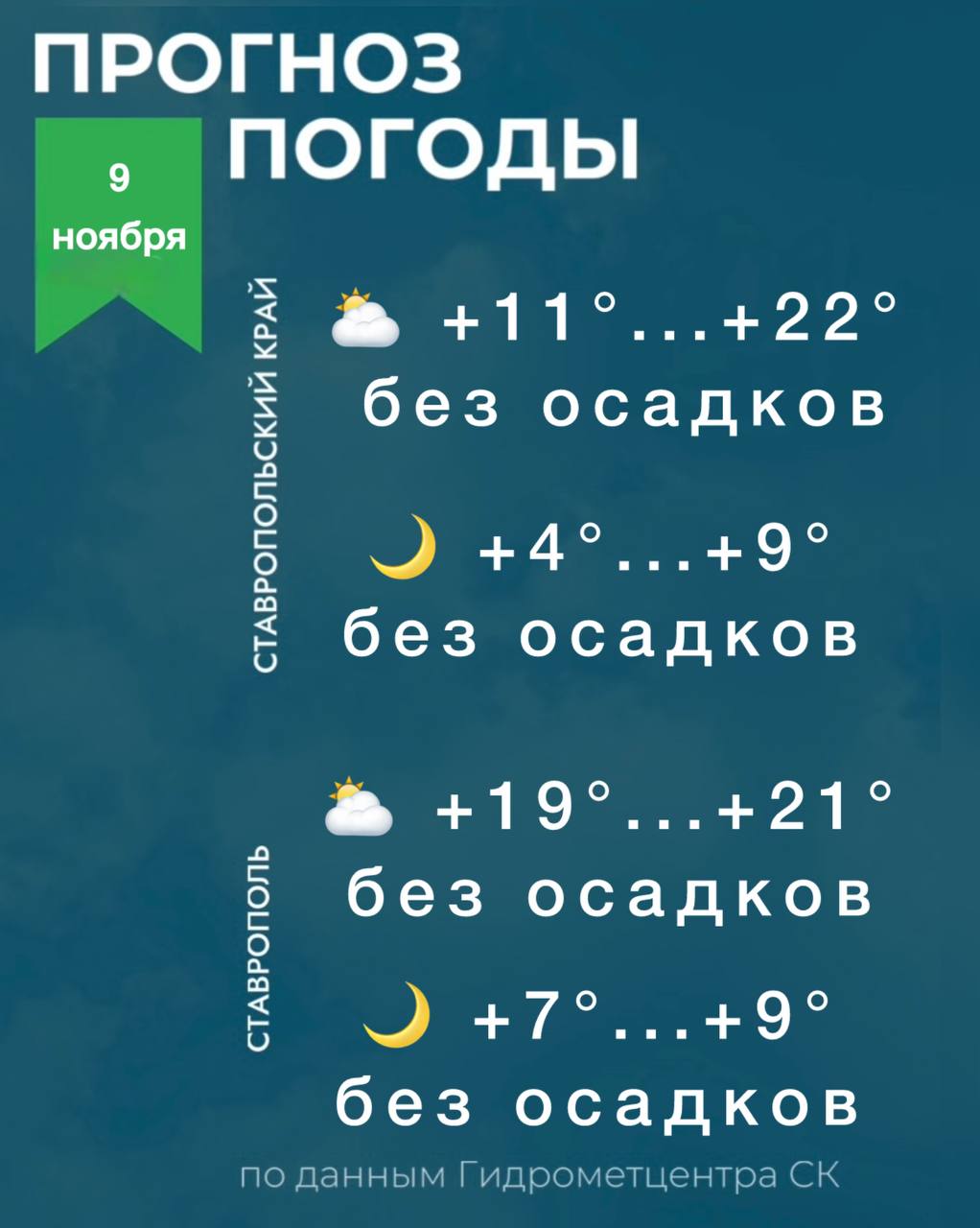 Об этом предупреждает ГУ МЧС России по региону. Завтра, 9 ноября, в крае будет переменная облачность, ночью и утром местами возможны туман и морось. Днём осадков не ожидается. Ветер будет дуть со скоростью 4-9 м/с.Температура воздуха по краю ночью...