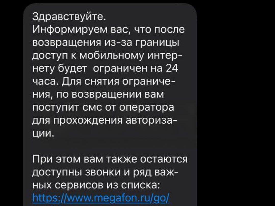 После возвращения из-за границы абоненту приходит SMS с инструкцией по верификации, без нее мобильный интернет временно недоступен.