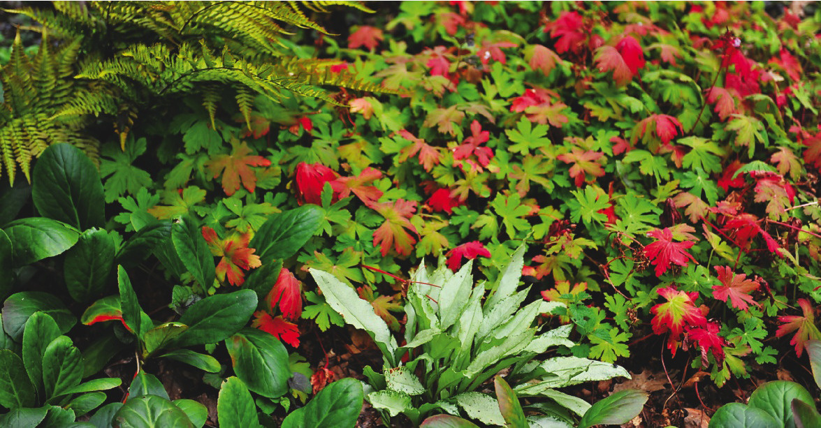 - Герань крупнокорневищная: формирует изящный ковер из листьев и цветёт в июне.