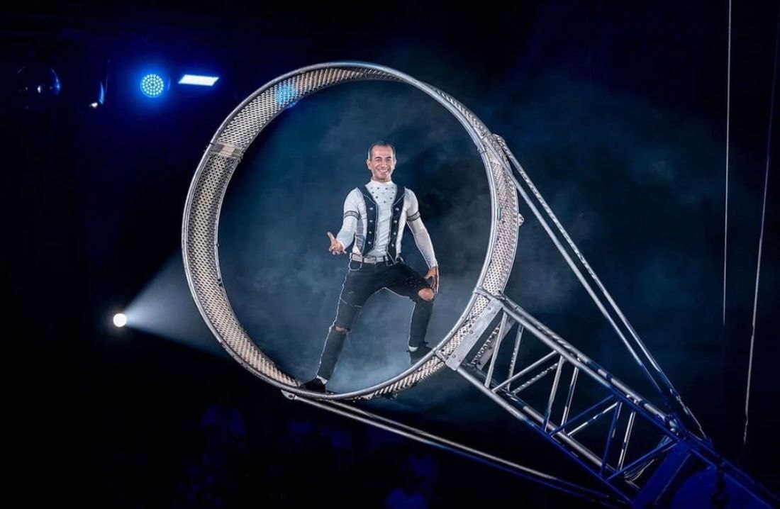 Карен Сафарян выступает на "Колесе смелости". Так называется подвешенная в воздухе конструкция, которую акробат сам раскручивает и выполняет на ней рискованные трюки. Этот номер - настоящий вызов законам физики и пределам человеческих возможностей!