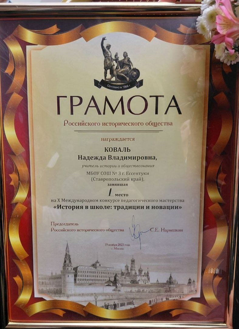 Надежда Коваль, учитель истории и обществознания школы № 3 Ессентуков, заняла 1е место во Всероссийском конкурсе «История в школе: традиции и новации».
