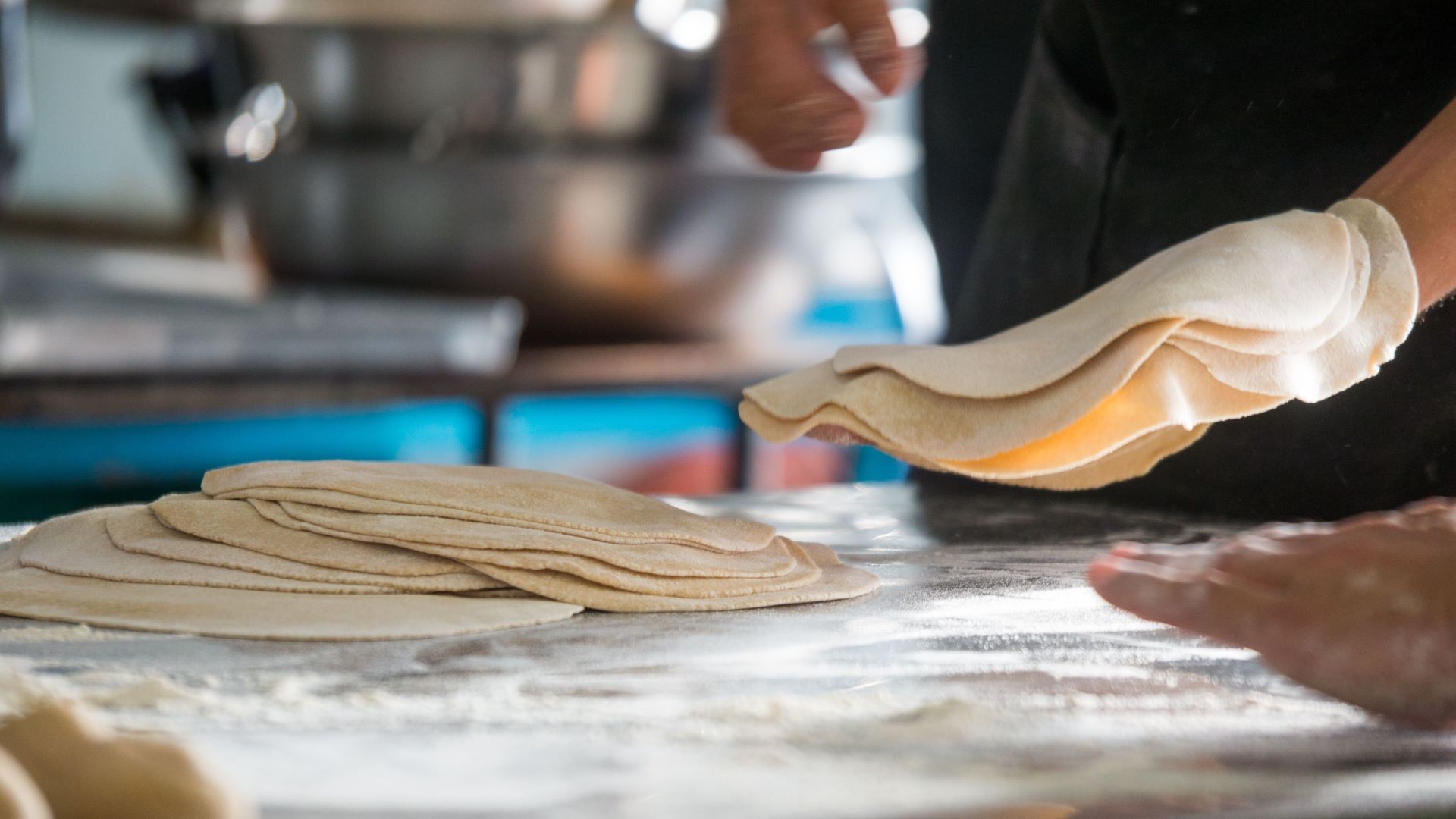 Насыпьте муку в миску и сделайте углубление в середине. Добавьте туда растительное масло, всыпьте соль и сахар. Помешивая, влейте кипяченую или минеральную воду. Используйте столько жидкости, чтобы получилось упругое тесто. Замешивайте его пять–шесть минут.