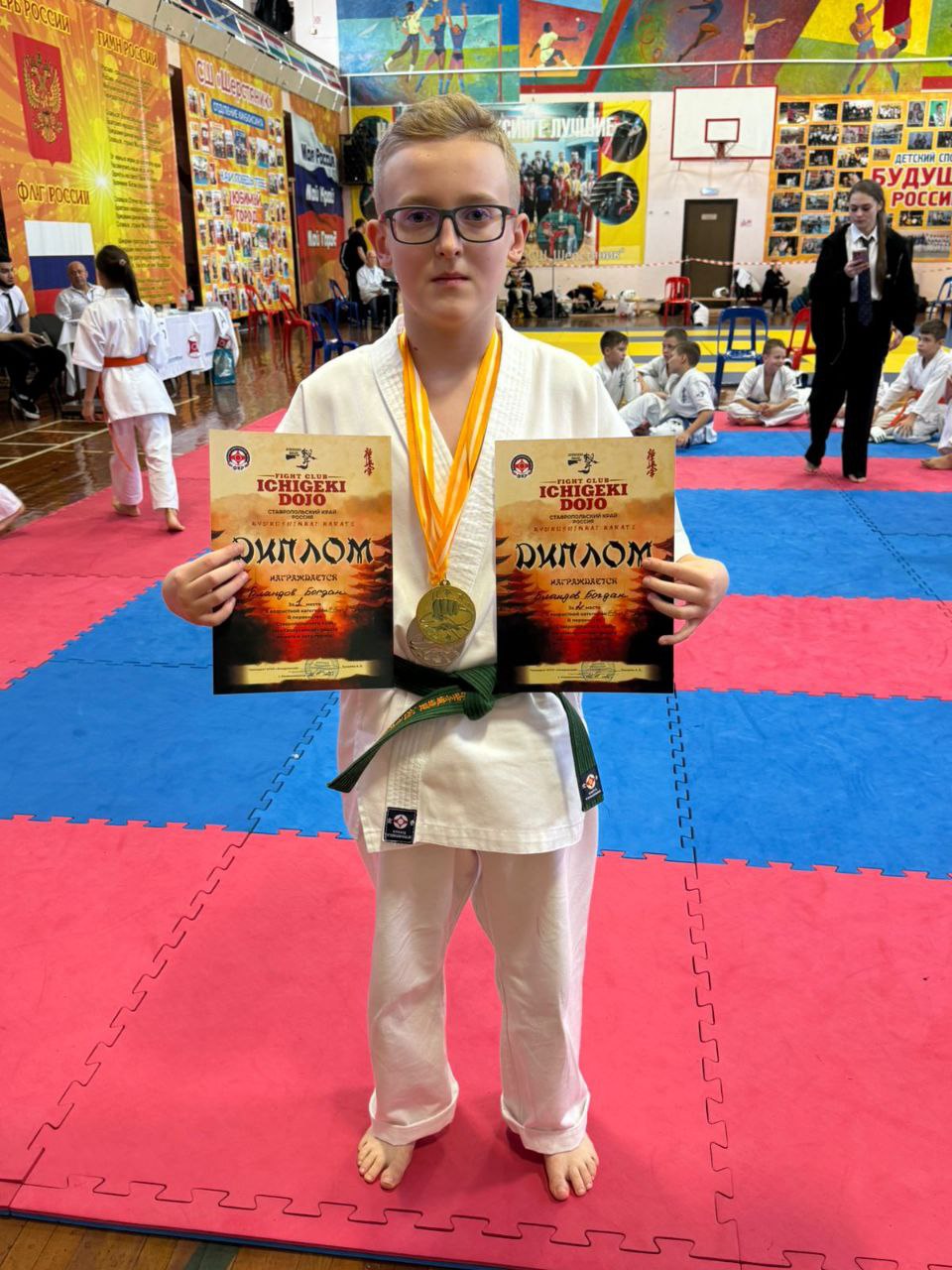 Поздравляем ученика 5А класса МБОУ СОШ №1 Бландова Богдана, который стал победителем первенства Ставропольского края по киокушинкай каратэ. Соревнования состоялись 22 ноября 2025 года в городе Невинномысске. Богдан занял 1 место в дисциплине «Ката-группа» и 2 место в дисциплине «Индивидуальное ката».