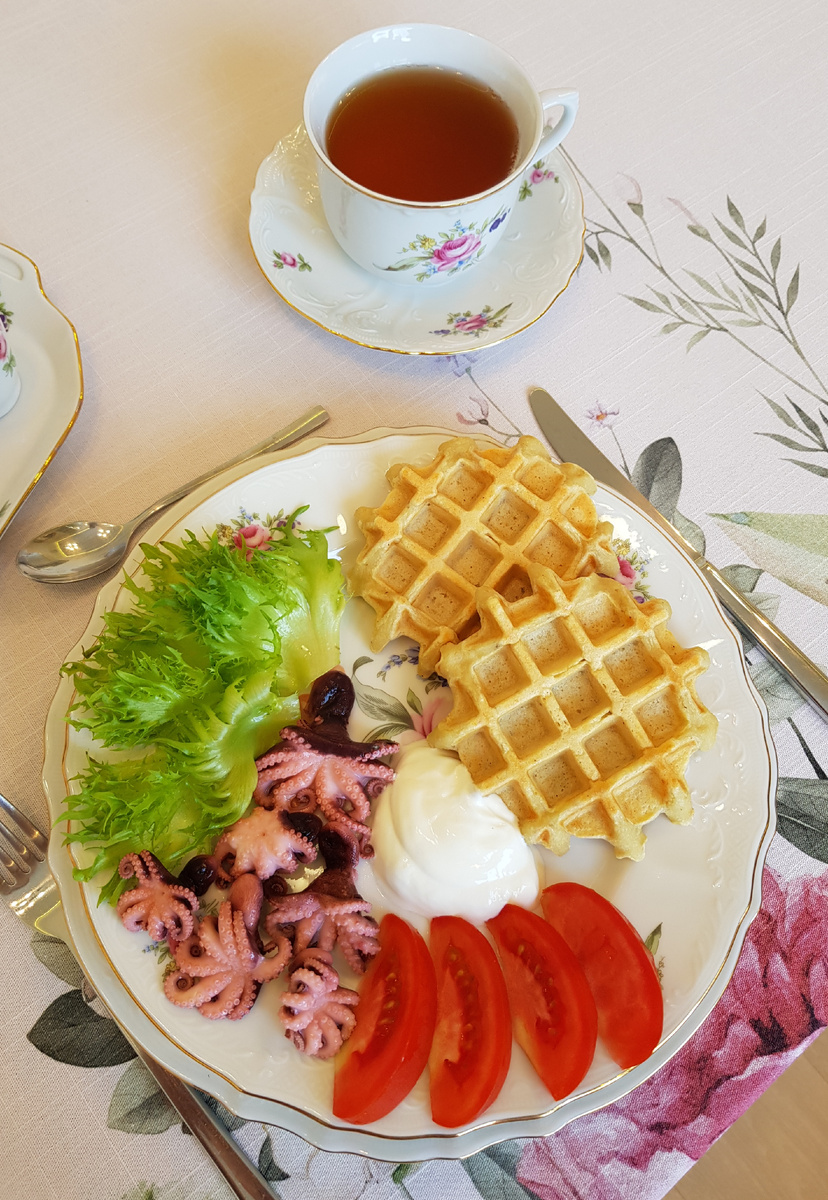 Готовые картофельные вафли будут ещё вкуснее с подачей. Они отлично сочетаются со сметаной, свежими листьями салата или яркими помидорами. Это блюдо можно также дополнить головкой осьминога для интересного акцента. Приятного аппетита!