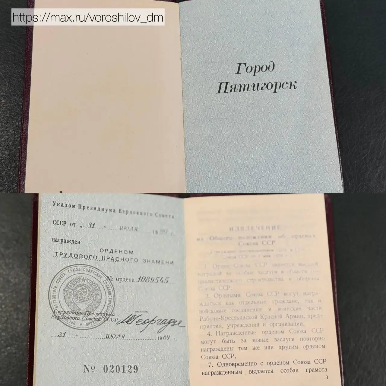 "Указом Президиума Верховного Совета СССР от 31 июля 1980 года город Пятигорск был награжден орденом Трудового Красного Знамени. Долгое время судьба ордена была неизвестна, и считалось, что в 90-е годы он был утерян. Во время инвентаризации в администрации города, в одном из старых сейфов, главная награда Пятигорска была найдена", - написал Ворошилов.