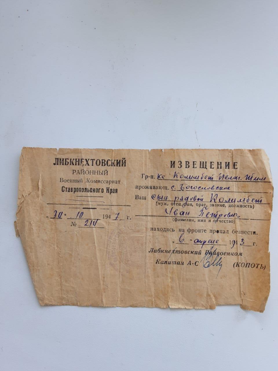 «Сейчас удалось установить точную дату гибели Ивана Петровича — 6 декабря 1942 года. Активист Наталья Дзюба нашла родственников нашего героя, они проживают у нас в Невинномысске», — рассказал Григорий Касмынин.