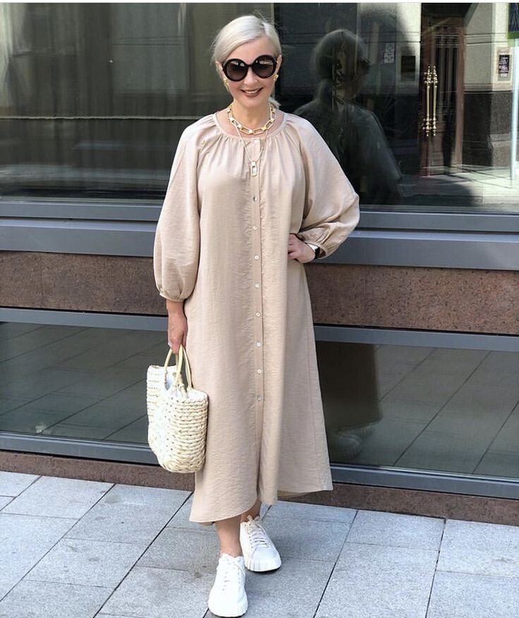 Оригинальное бежевое платье-рубашка с широким подолом и объемными рукавами-фонариками — идеальный выбор для летнего сезона. Это комфортное платье можно комбинировать с удобными белыми кроссовками, что создаст расслабленный, но в то же время стильный образ.