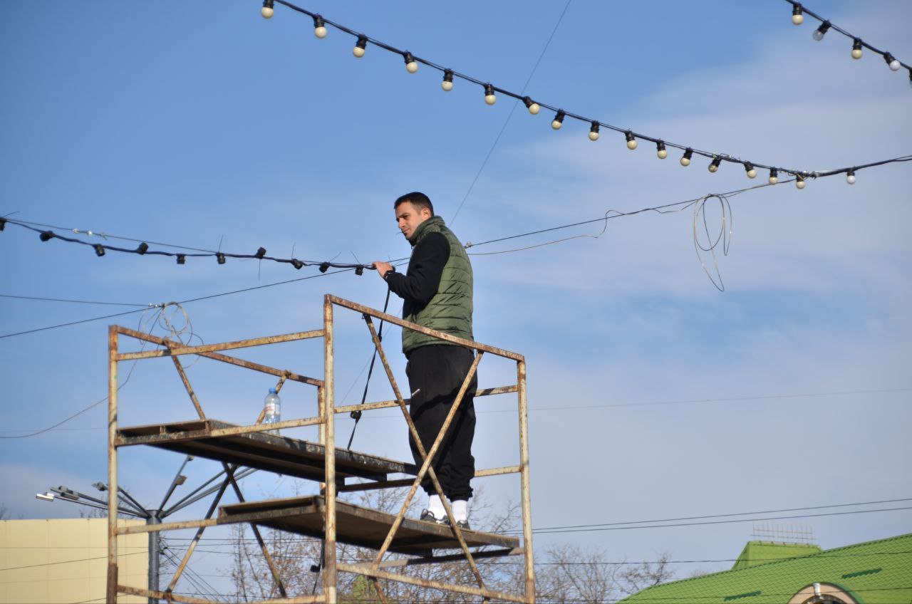 Продолжается установка светодиодной подсветки, звёздная вуаль у ёлки станет доминантой в украшении локации.