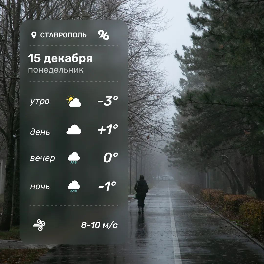 Ветер западный 5-10 м/с. В понедельник, 15 декабря, температура воздуха по краю ночью -4...-9°, днём -2...+3°.В Ставрополе слабый снег, мокрый снег, на дорогах гололедица...
