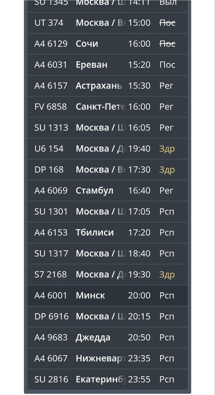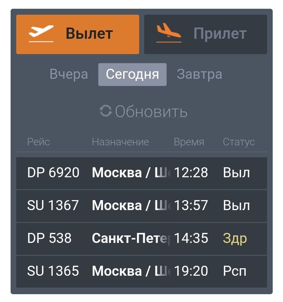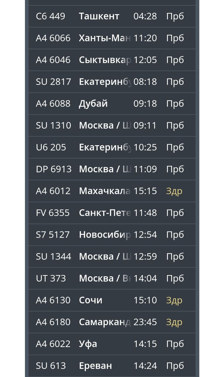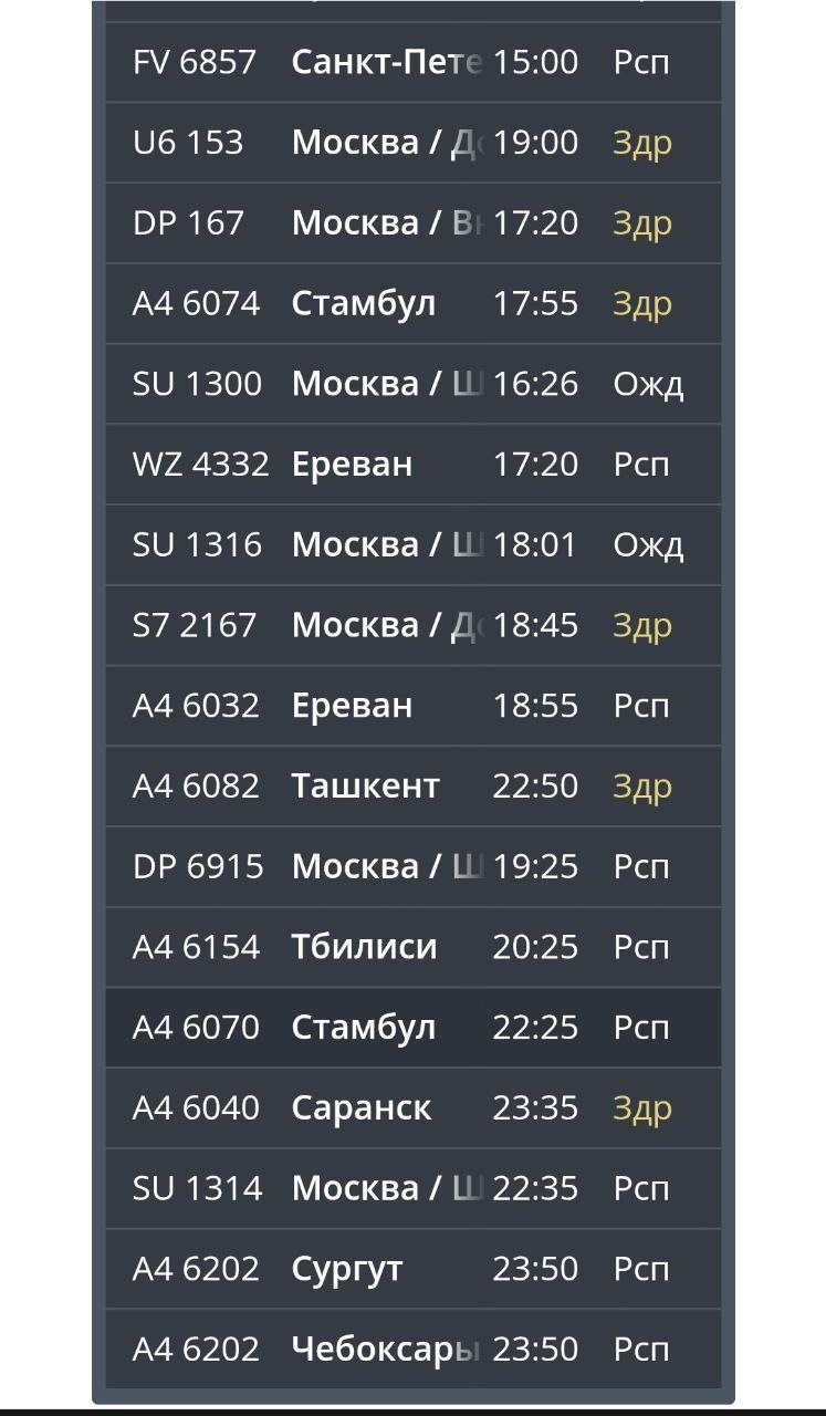 На вылет задерживаются три вечерних рейса в Москву. На прилёт – рейсы из столицы, Сочи, Самаркандта, Стамбула, Ташкента, Махачкалы, Саранска.