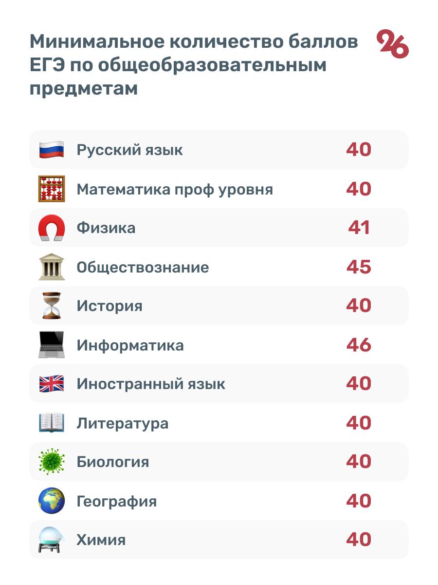 Самые высокие минимальные баллы заявлены по обществознанию и информатике — 45 и 46 соответственно.