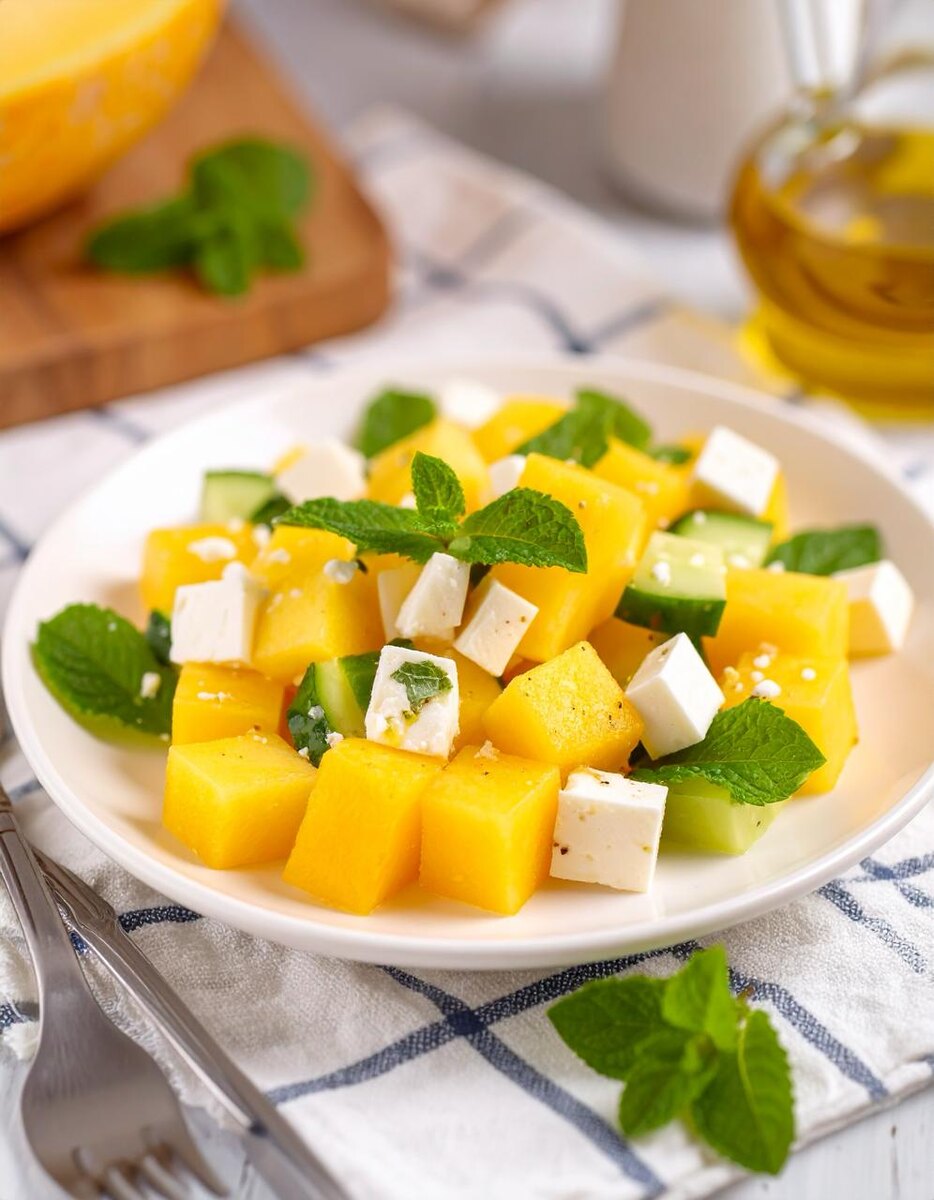 Но дыня это не только десерт. Её можно использовать и в интересных «несладких» сочетаниях. Например, освежающий салат с дыней, фетой и огурцом идеально подходит для уютного домашнего ужина.