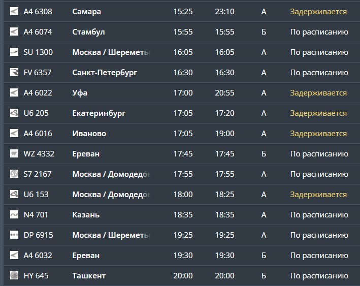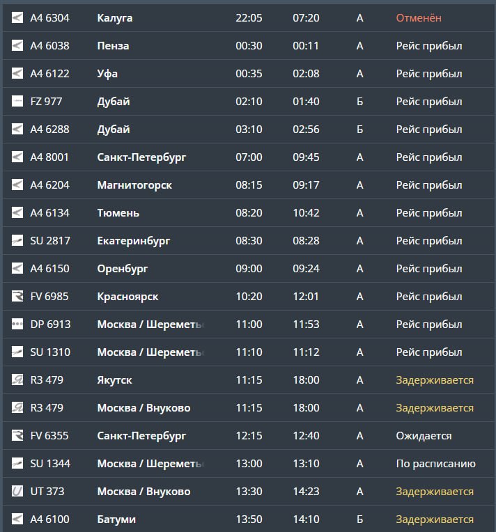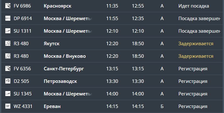 Два – на вылет в Якутск и Москву. Остальные – на прилет из Якутска, Москвы, Батуми, Самары, Уфы, Екатеринбурга, Иваново.