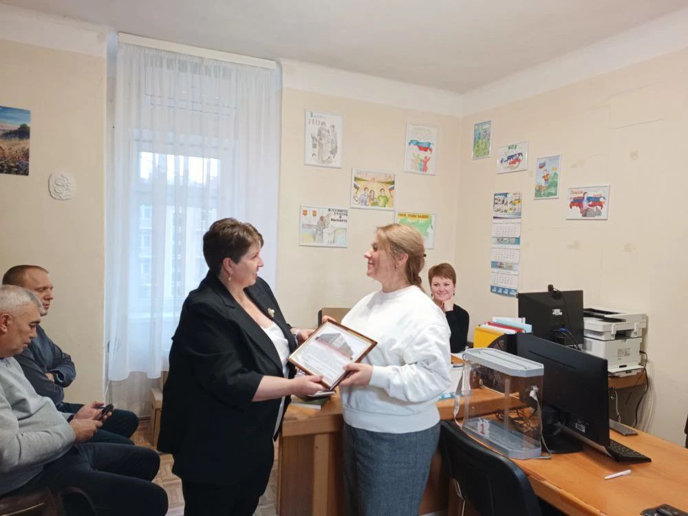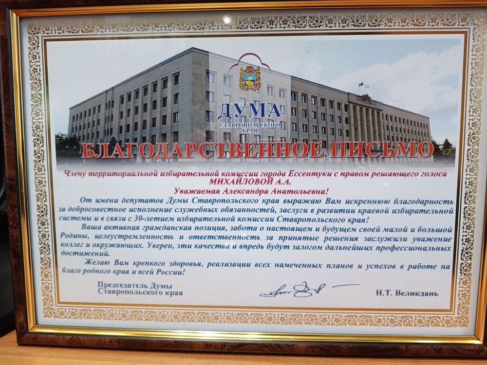 Заседание началось с приятного и знакового события. За добросовестное исполнение служебных обязанностей члену комиссии Михайловой Александре Анатольевне было вручено Благодарственное письмо Думы Ставропольского края.