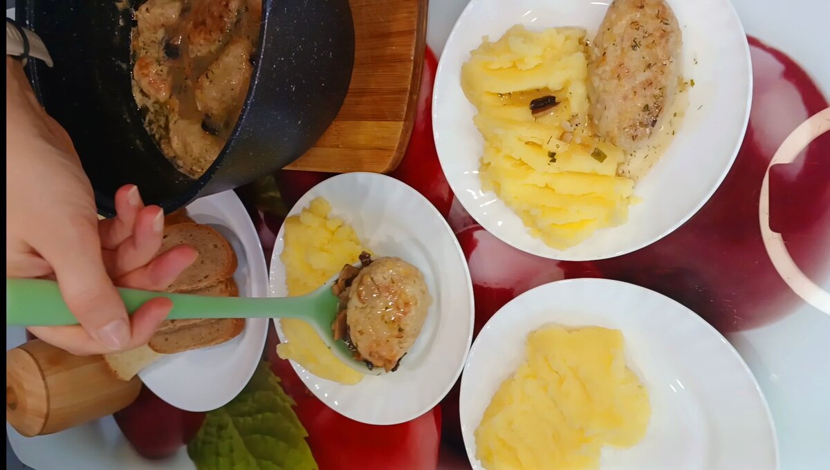 Для соуса на другой сковороде готовят грибы, обжаривая их до мягкости. Затем добавляют муку, вливают воду или бульон, минерализуют чесноком и зеленью, доводят до кипения.