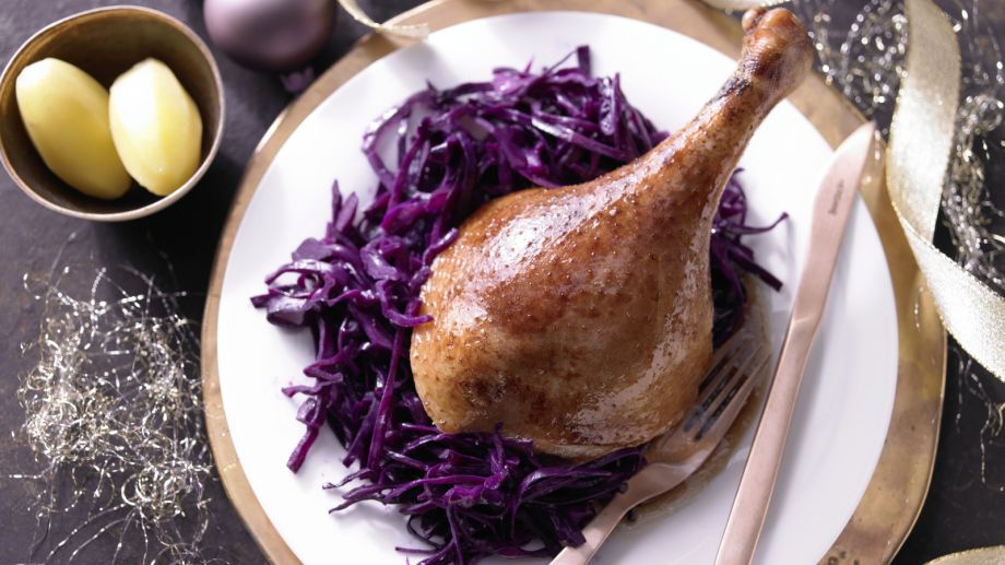 7. В завершение процедите соус от жира, доведите его до кипения и добавьте последние штрихи по вкусу. Разделите гуся на порции и подавайте с красной капустой и картофелем для завершения кулинарного торжества!
