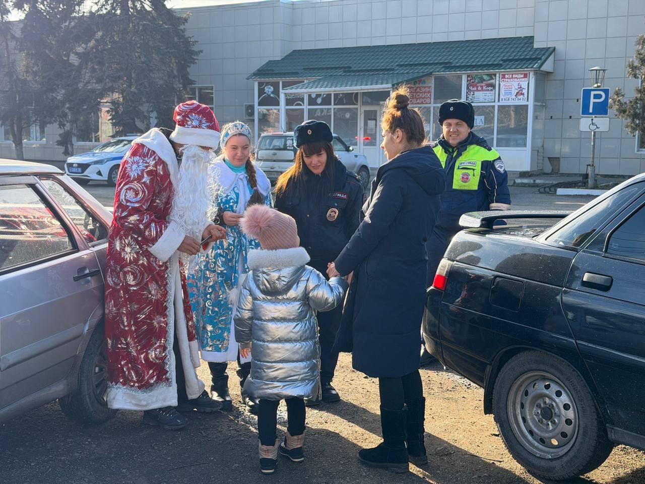 На улицах села Кочубеевского Дед Мороз и Снегурочка поздравляли всех водителей, пассажиров и пешеходов с наступающим Новым Годом, а также ненавязчиво проверяли соблюдение ими правил дорожного движения. Участникам акции сказочные персонажи вручили новогодние подарки.