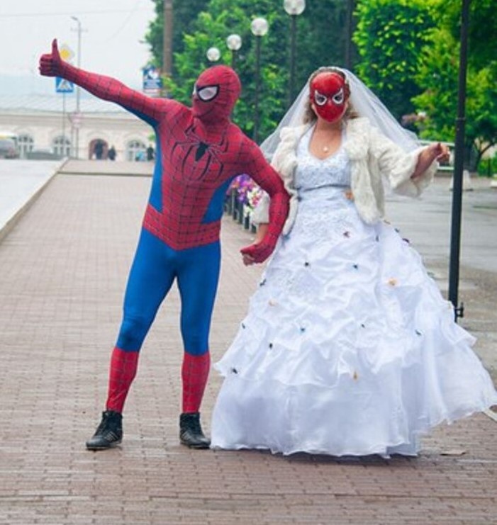- Одни женихи и невесты не боятся показывать свои увлечения даже на самом важном событии в жизни. Например, один из таких молодожёнов выбрал костюм Человека-паука, а его невеста решила поддержать его, надев маску этого героя. Это стало настоящим хитом свадебной моды, которая точно не оставила бы равнодушными детей и взрослых.