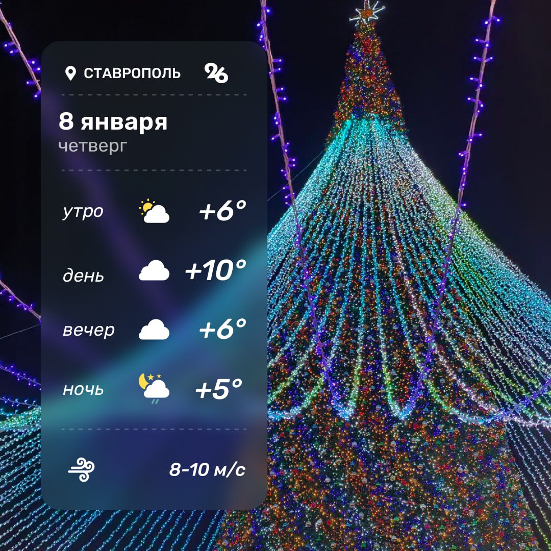 Ветер западный 6-11 м/с, порывы 12-14 м/с. В пятницу, 9 января, температура воздуха по краю ночью 0...+5°, днём +4...+9°.В Ставрополе дождь, днём +5...+7°.