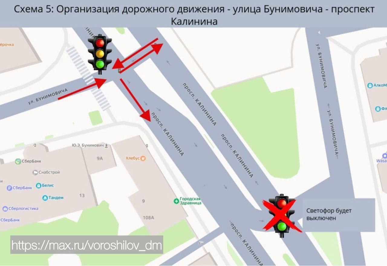 На пересечении пр. Калинина и ул. Бунимовича выезд с ул. Бунимовича будет разрешен во всех направлениях, светофор поворота с пр. Калинина на ул. Бунимовича (автовокзал) будет отключен (Схема 5).