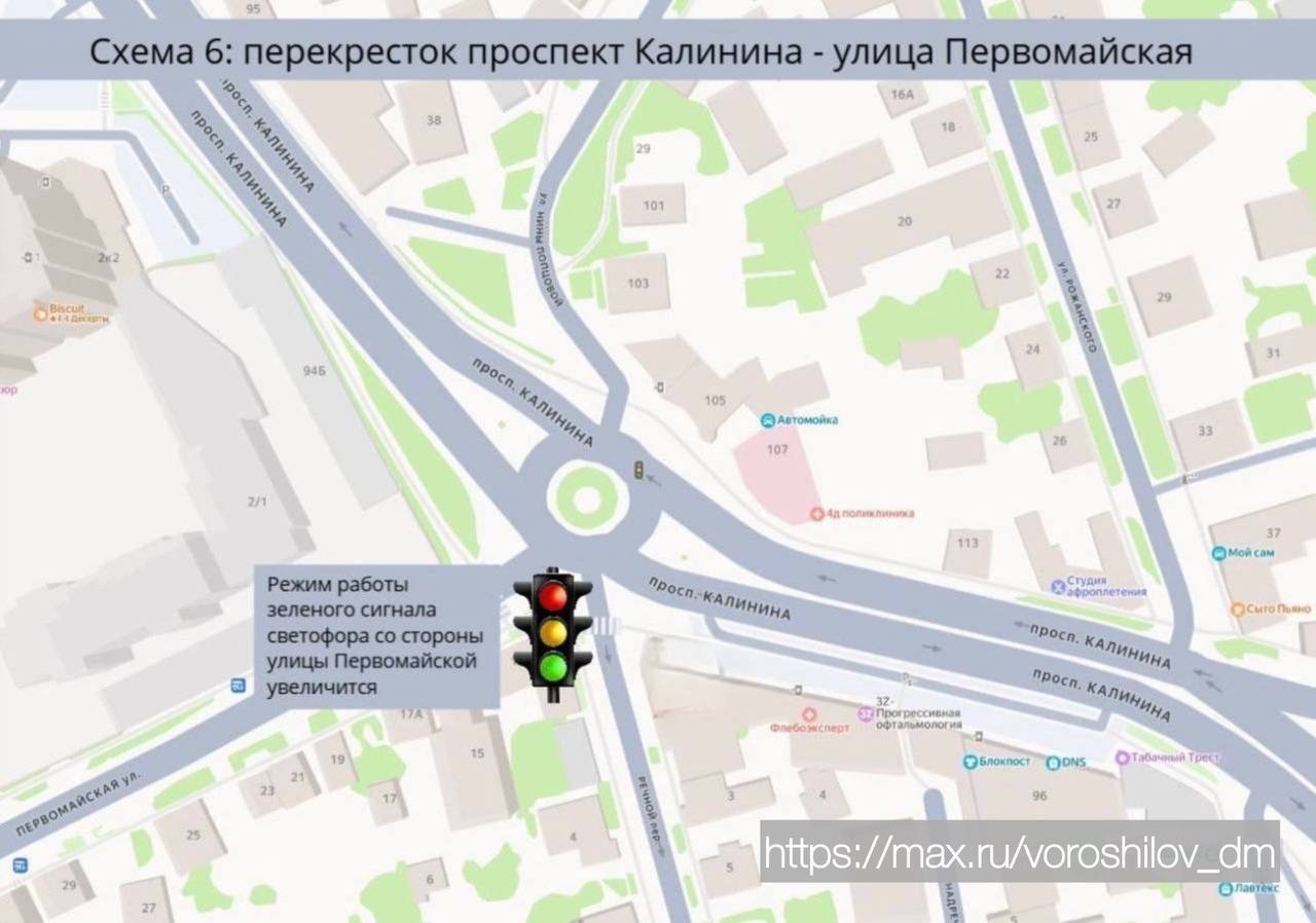 На перекрестке проспект Калинина – улица Первомайская на светофорном объекте со стороны улицы Первомайской увеличено время горения зелёного сигнала светофора (Схема 6).