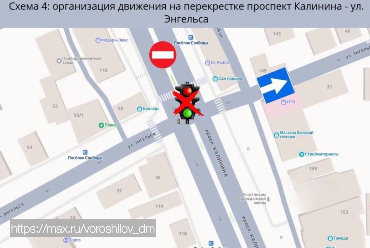 На пересечении пр. Калинина и улиц Энгельса и Набережной светофорный объект будет отключен. Напоминаю, на ул. Набережной в направлении пр. Советской Армии организовано одностороннее движение. (Схема 4)