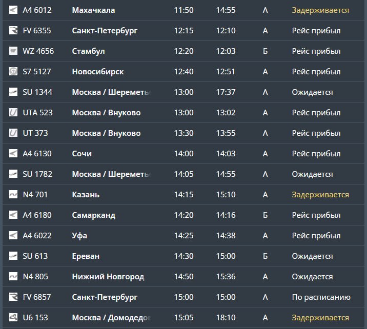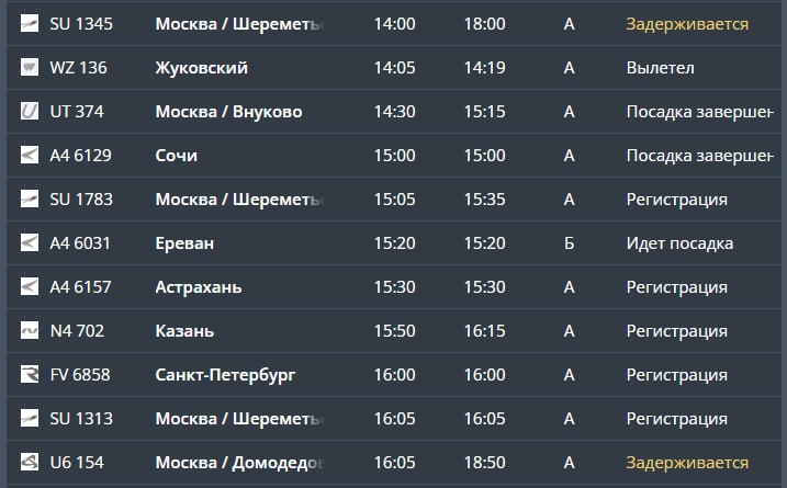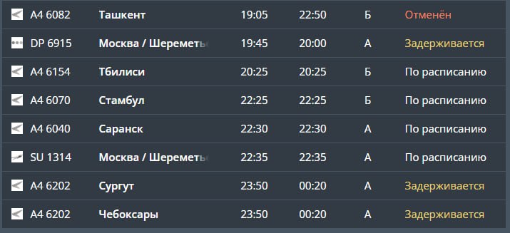 Два – на вылет (Шереметьево и Домодедово), остальные – на прилет (Махачкала, Казань, Домодедово, Шереметьево, Сургут и Чебоксары), следует из онлайн-табло.