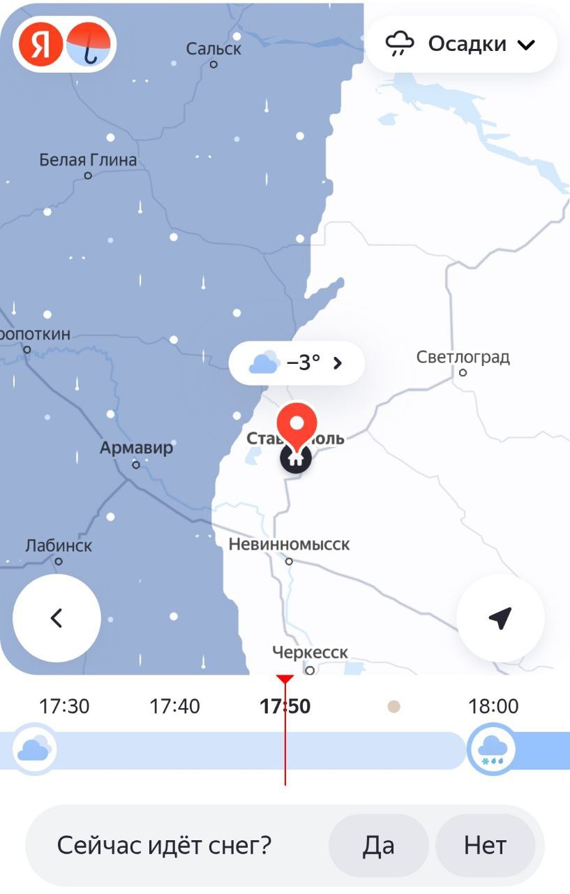 Судя по данным Яндекс.Погоды, сильный снегопад движется в Ставропольский край с запада и накроет часть региона сегодня ночью и завтра утром.