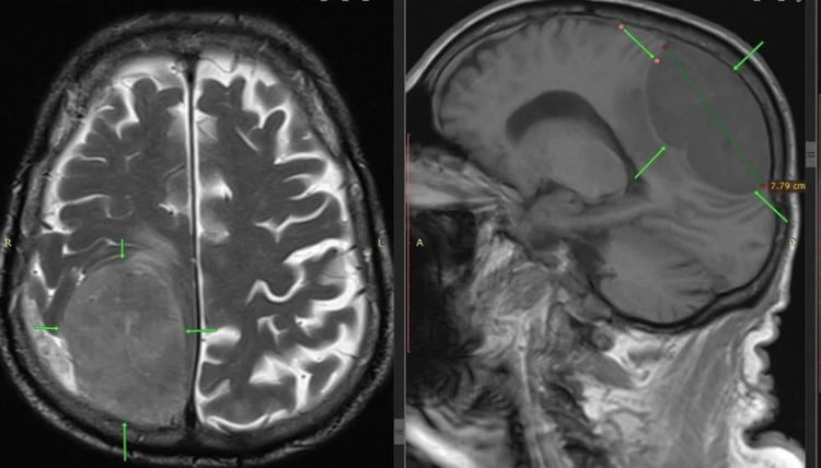 Мужчина попал в больницу, когда у него уже отказала левая нога и левая половина тела. Изначально врачи подозревали инсульт, но все оказалось куда сложнее – в правой теменно-затылочной области мозга нашли опухоль размером 87 см.