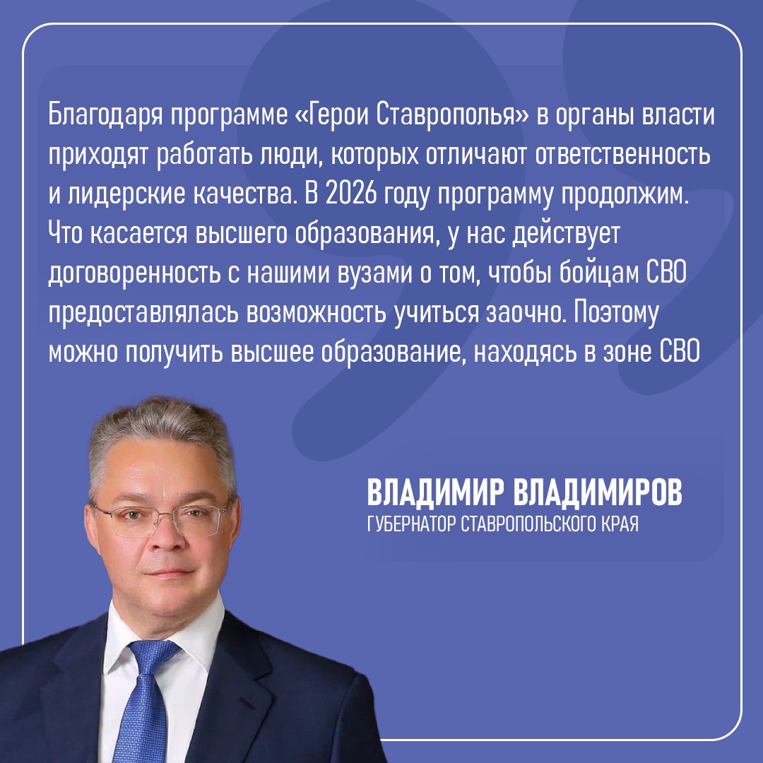 Глава региона ответил, что в 2026 году будет новый набор ветеранов для переобучения. Кроме того, на сегодняшний день действует договоренность с краевыми вузами о том, чтобы бойцам СВО предоставлялась возможность получать образование заочно.