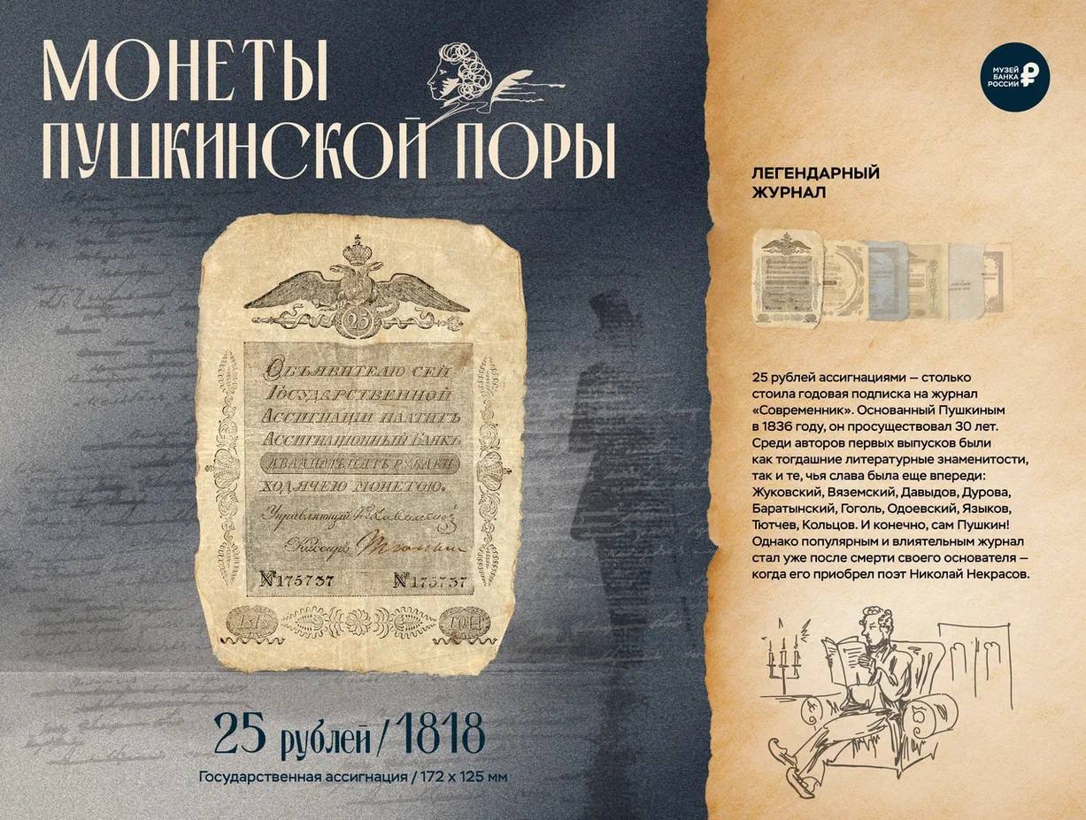 Посетители узнают, почему мелочь в те времена называли «кольцевиками», каким был гривенник, упомянутый в «Медном всаднике», и с чем можно сравнить стоимость годовой подписки на журнал «Современник».
