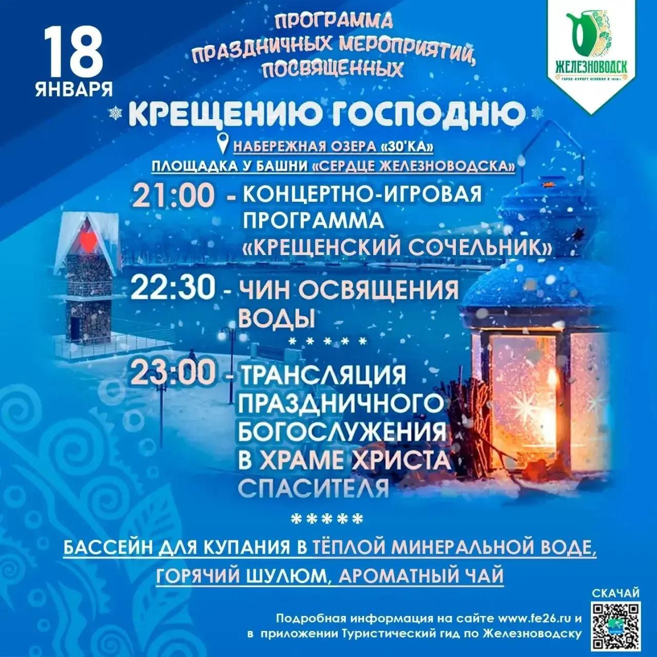 Основное купание пройдёт на курортном озере «30'Ка». Традиционно священники освятят этот и другие водоёмы города. Возле озера будут установлены детские бассейны с горячей минеральной водой и тёплые раздевалки. После купания гостей будут ждать горячий шулюм и ароматный чай.