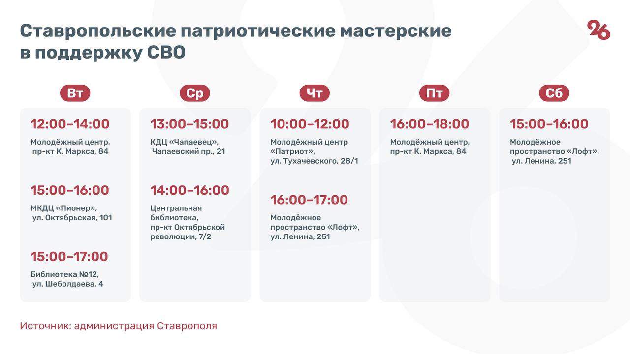 Жители и гости города смогут присоединиться к помощи бойцам СВО, приняв участие в работе патриотических мастерских, сообщает администрация краевого центра.