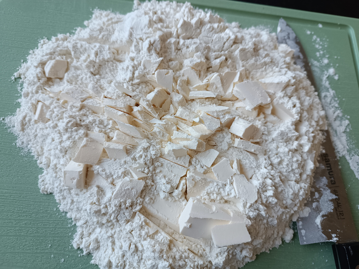 Первым делом важно приготовить тесто. Для этого в одной емкости смешивают воду, яйцо, уксус и водку. Затем в просеянную муку добавляют нарезанный кубиками маргарин и перетирают до состояния мелкой крошки. Полученную массу соединяют с яичной смесью, замешивают тесто и помещают в холодильник.