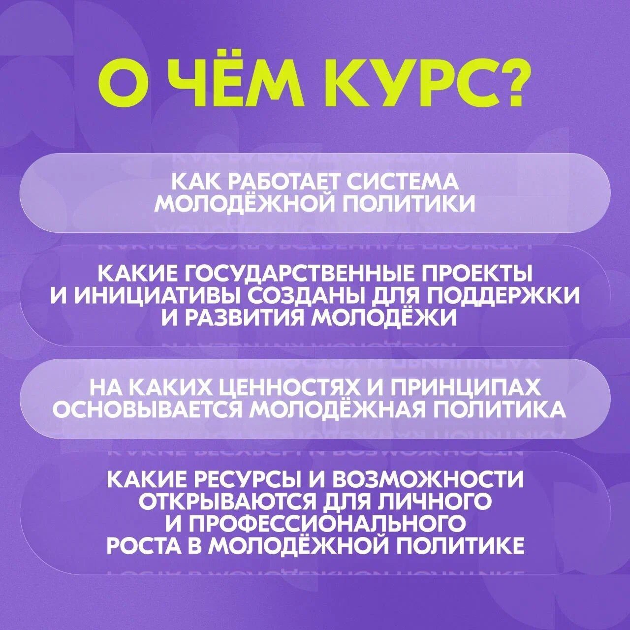 Курс уже доступен на Академии Росмолодёжи. Открывайте для себя мир молодёжной политики!