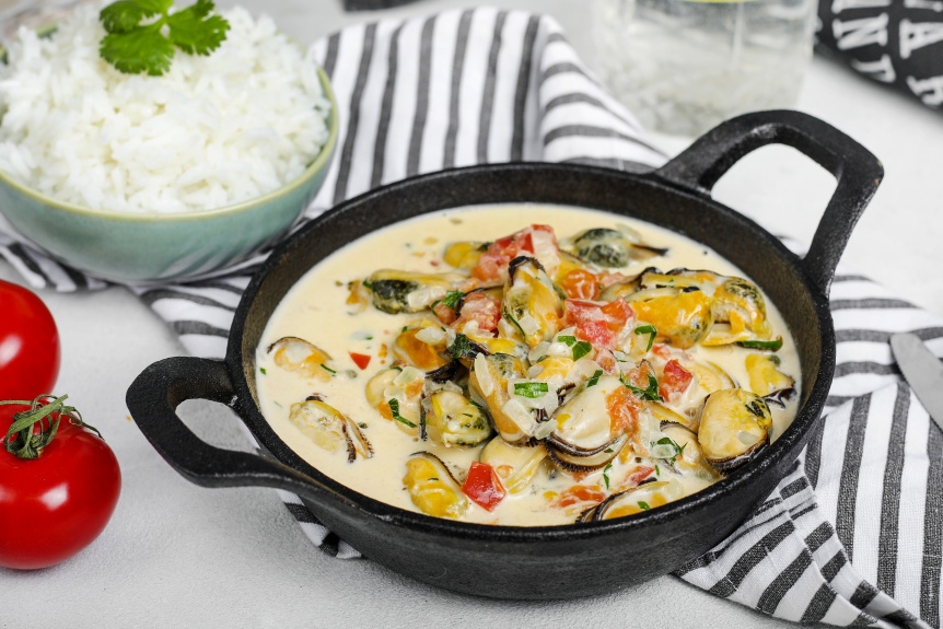 Шаг 4: Нарежьте помидор мелким кубиком и добавьте к мидиям, прогревая ещё 1-2 минуты. Уберите веточки тимьяна, нарежьте петрушку и добавьте в конце. Подавайте блюдо вместе с рисом, щедро полив мидии сливочным соусом.