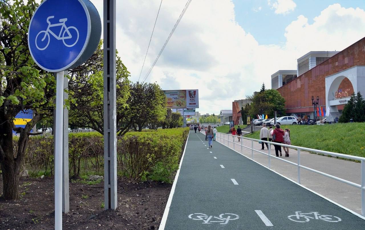 Первые пешеходы на первой в городе выделенной велодорожке у кинотеатра «Салют» в Ставрополе, 2015 год