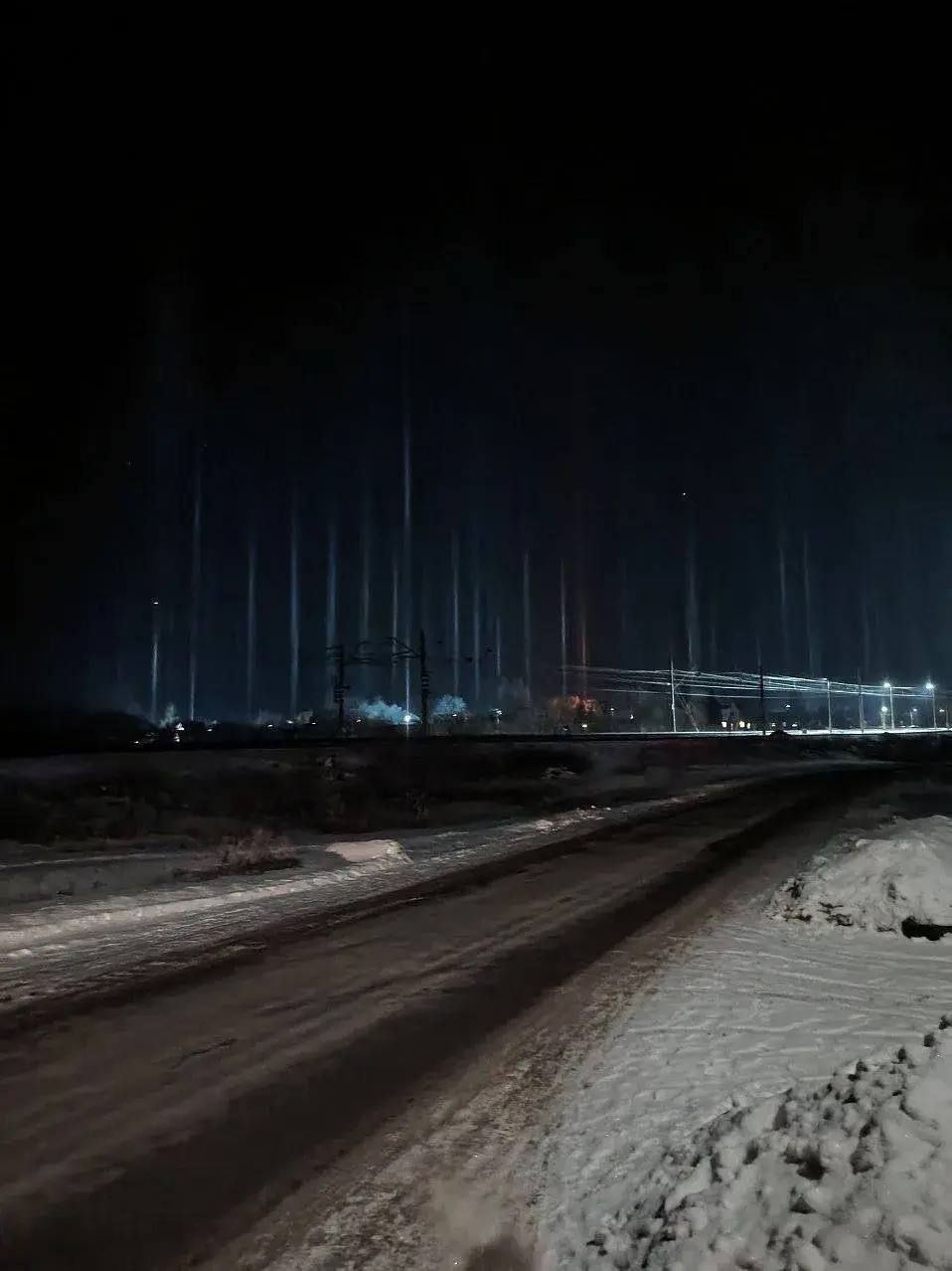 Световые столбы зимой - это атмосферное оптическое явление, возникающее в сильный мороз при высокой влажности и штиле. Плоские или столбовидные ледяные кристаллы, зависающие в воздухе («алмазная пыль»), работают как зеркала, отражая свет от фонарей, Луны или восходящего/заходящего Солнца.