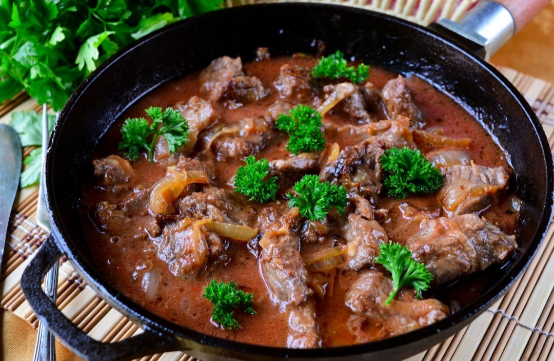 Главный акцент — паприка и медленное тушение. Важна не только последовательность добавления ингредиентов, но и умение дать аромату собраться: мясо нарезают на крупные куски, лук обжаривают до янтарности, а затем постепенно соединяют с пряной основой. Такой подход сохраняет цвет, глубину вкуса и текстуру, будто блюдо само дышит спокойствием кухни.
