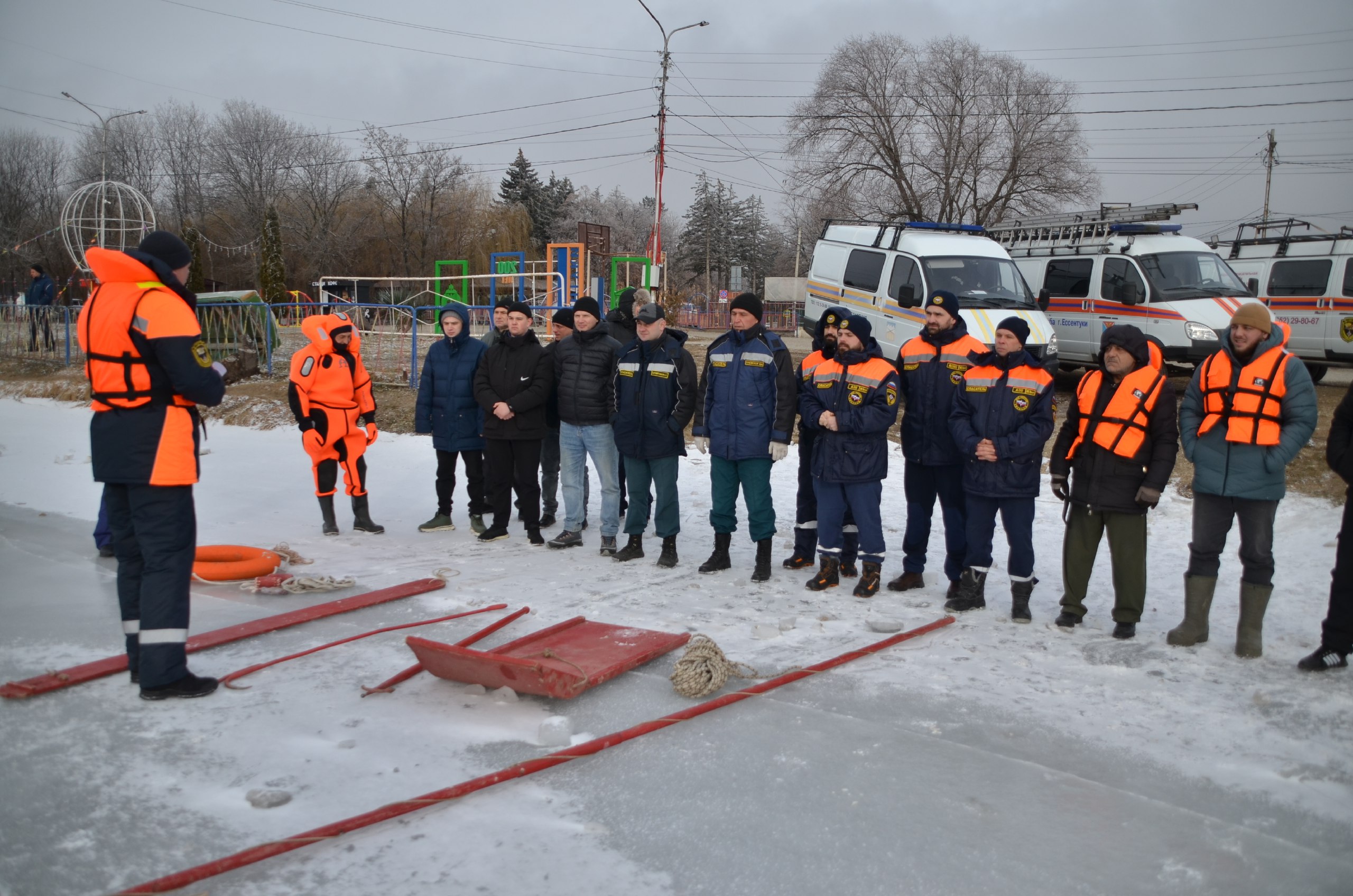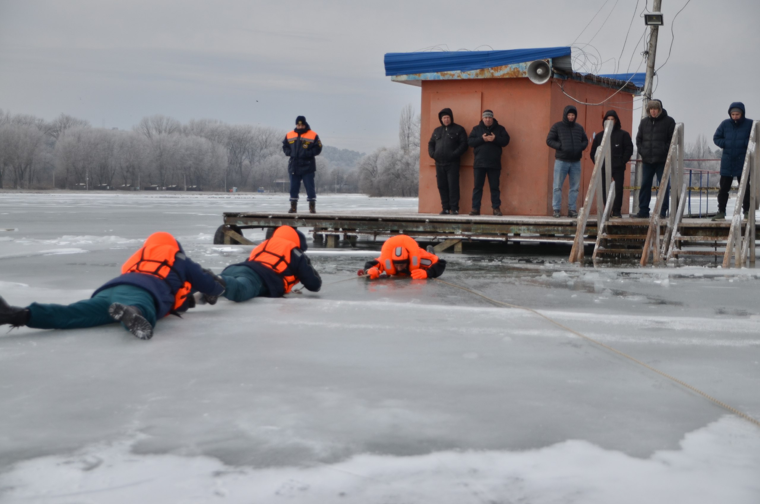 Спасатели отработали эвакуацию из ледяной воды и применение спасательных средств.